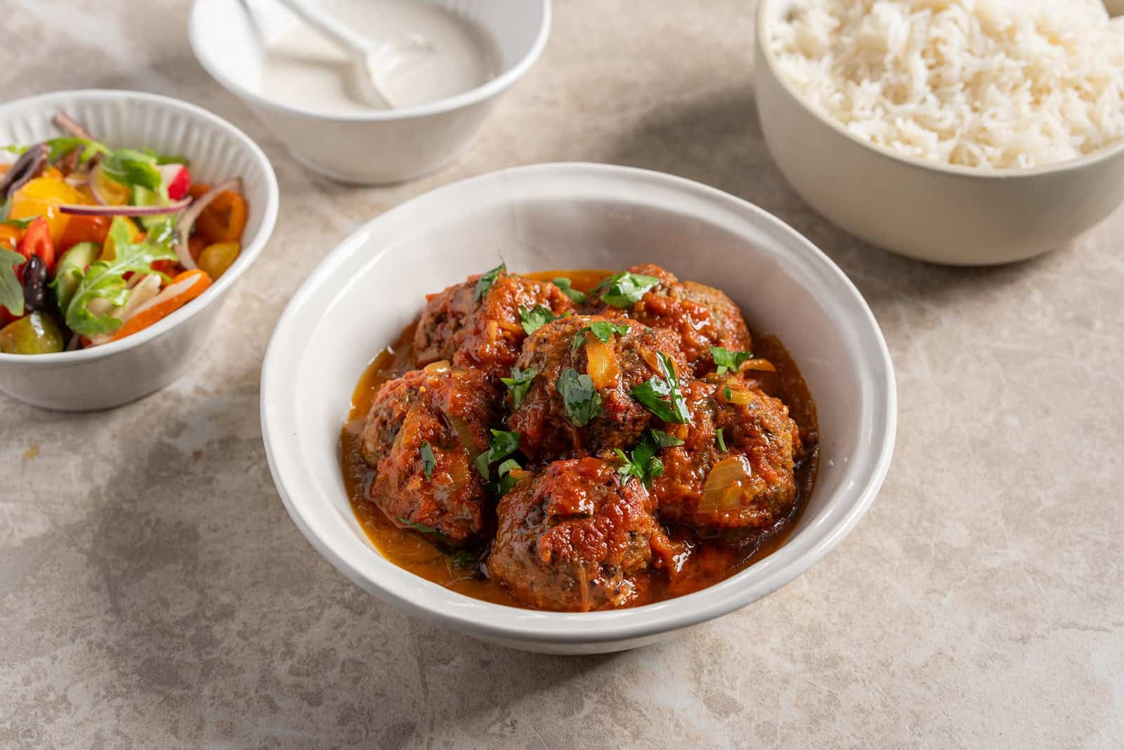 קציצות בקר מבשר הבקר של מרעה גולן בתוספת אורז בסמטי קלאסי לבן, סלט שוק טרי מירקות של משק חביביאן וטחינה