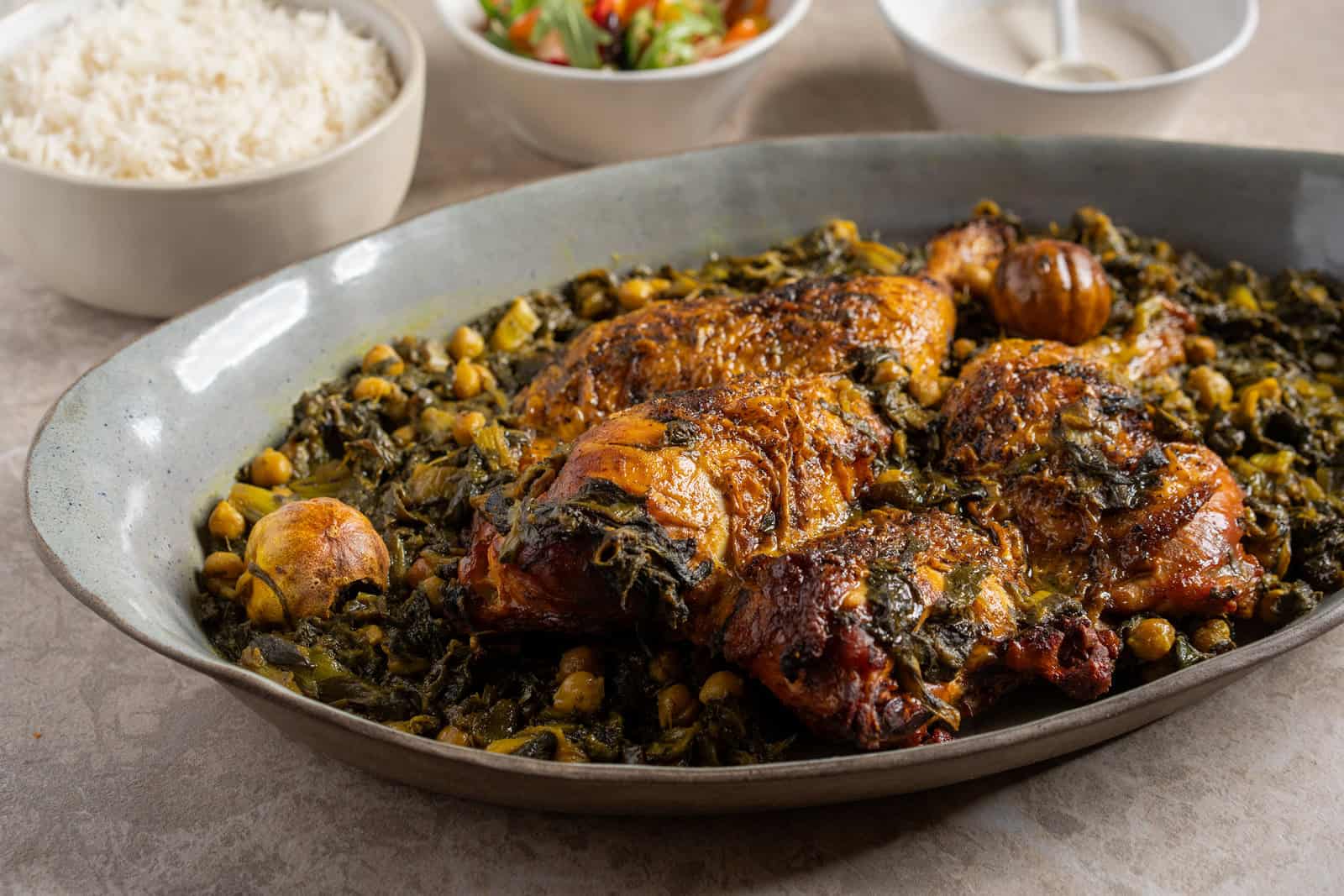 עוף אורגני עם מנגולד ולימון פרסי, מג’דרה פריקה של לובנא, סלט שוק וטחינה