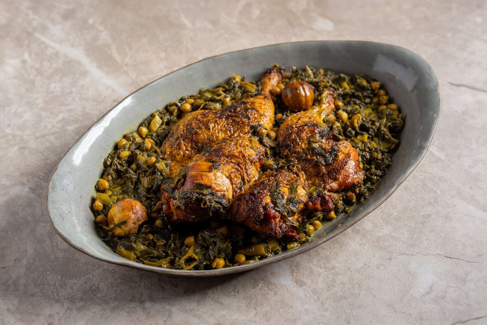 עוף אורגני במנגולד וחומוס – קדירת עוף שלם מחולק למנות צלוי עם חומוס, מנגולד, לימון פרסי ותערובת תבלינים פרסית
