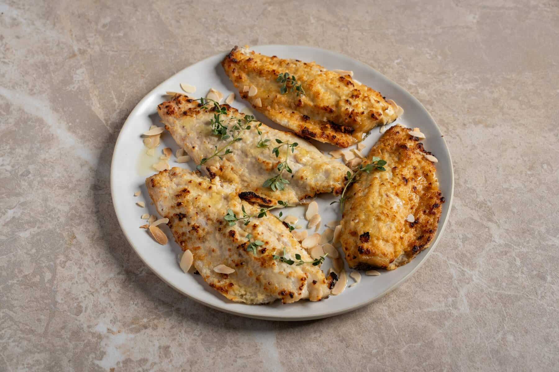 פורל בקרם לימון כבוש ושקדים לצלייה בבית. מגיע מוכן לאפייה בבית הלקוח.